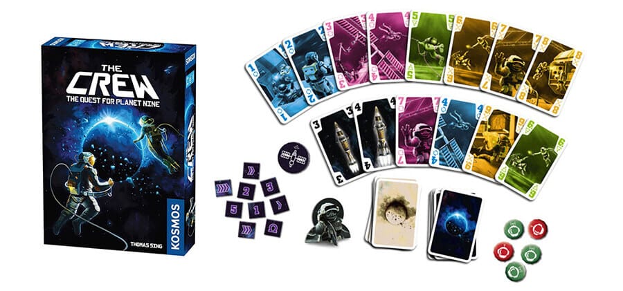 The Crew consists of a deck of 40 cards in 4 colored suits with values from 1 to 10. In addition, there are 4 “Rocket” cards, which are wild cards. Like most trick-taking games, the initial card played sets the suit that must be followed.